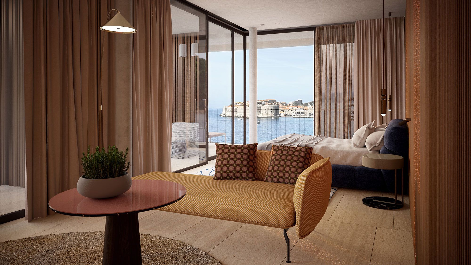 Its rooms and suites are adorned with richly textured Mediterranean fabrics and framed by private terraces overlooking Lokrum Island and the ancient rooftops of the Old City.